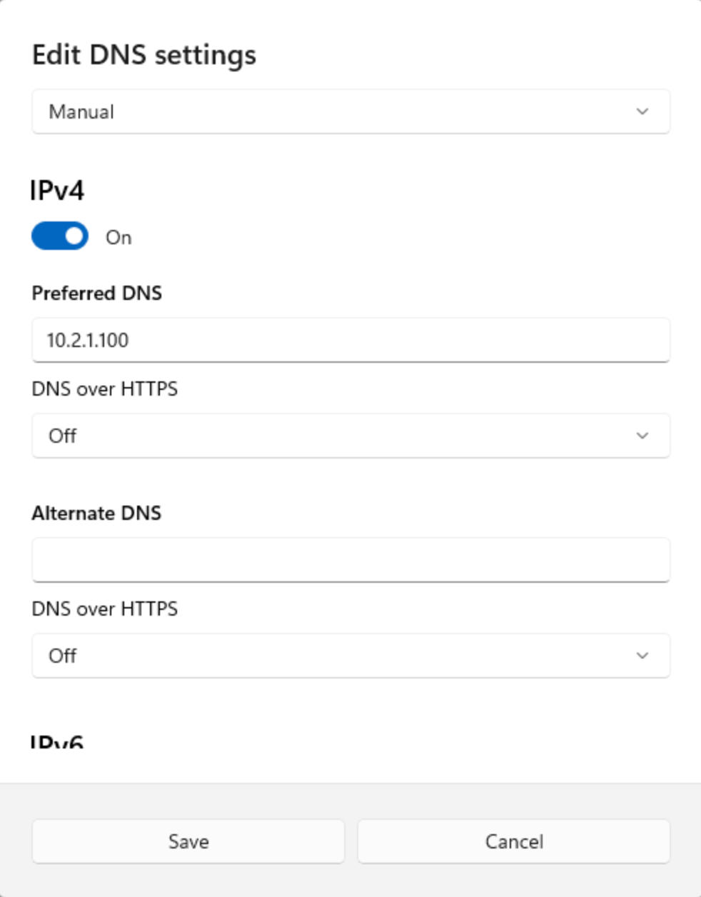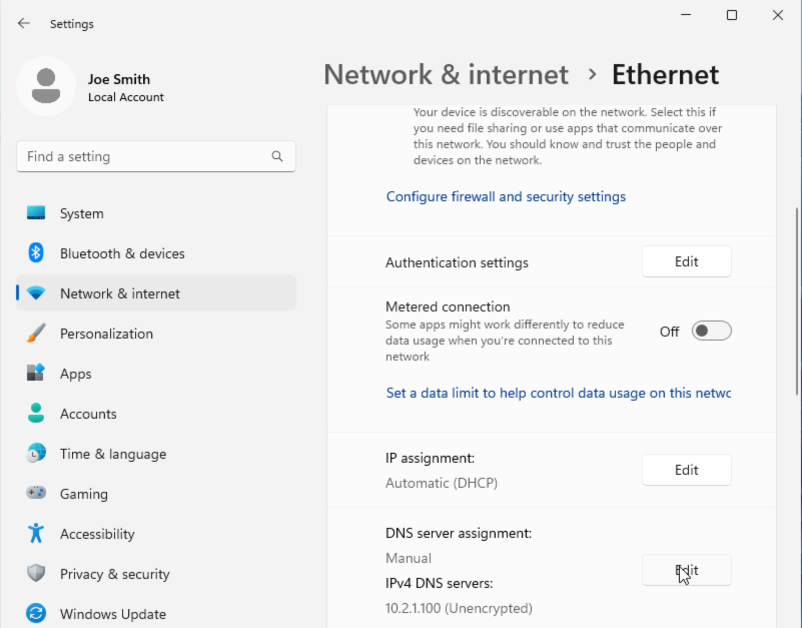 Network and InternetandEthernetin the settingsDNS server assignmentand enter the IP of the Domain Controller (make sure this IP is static)