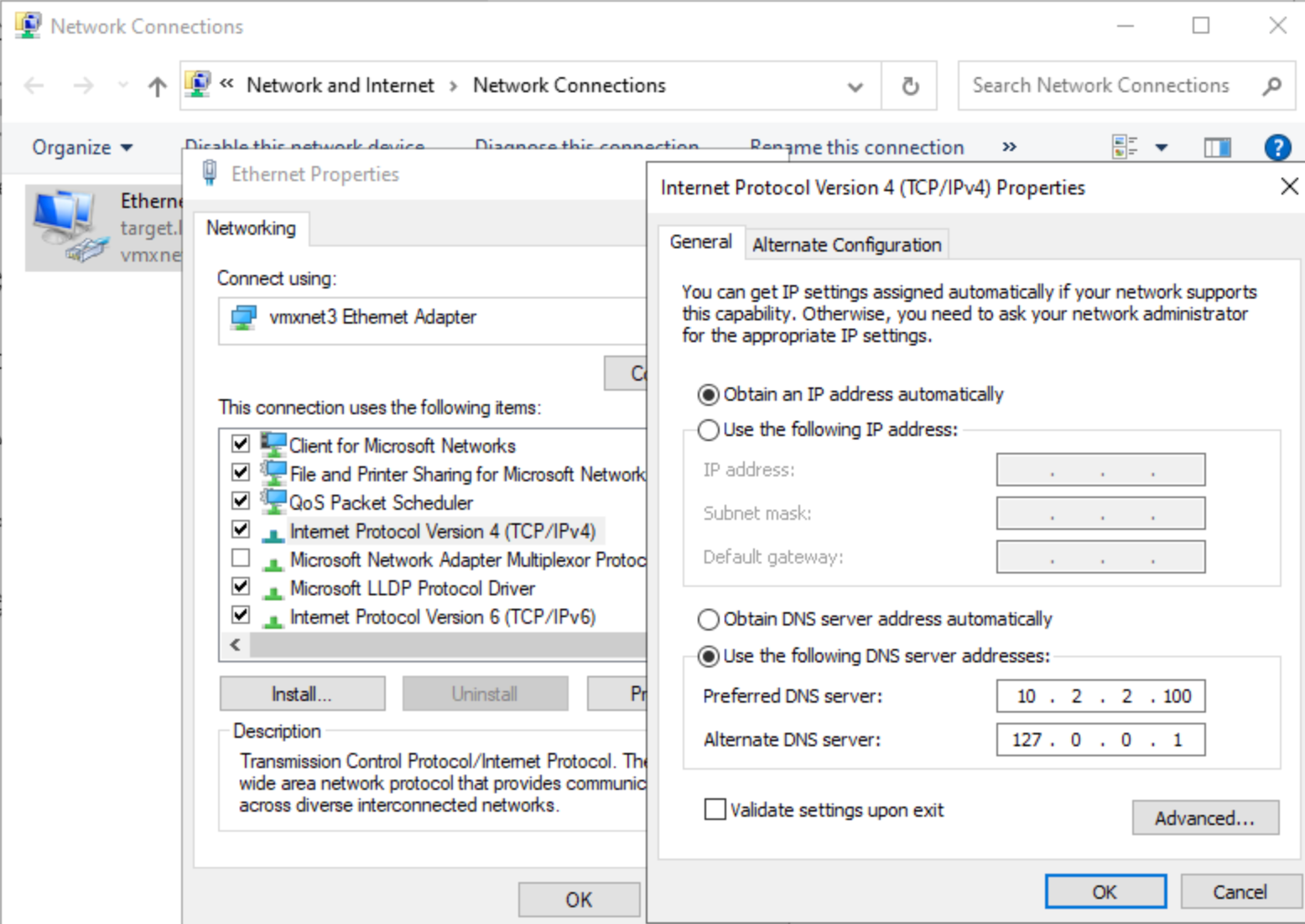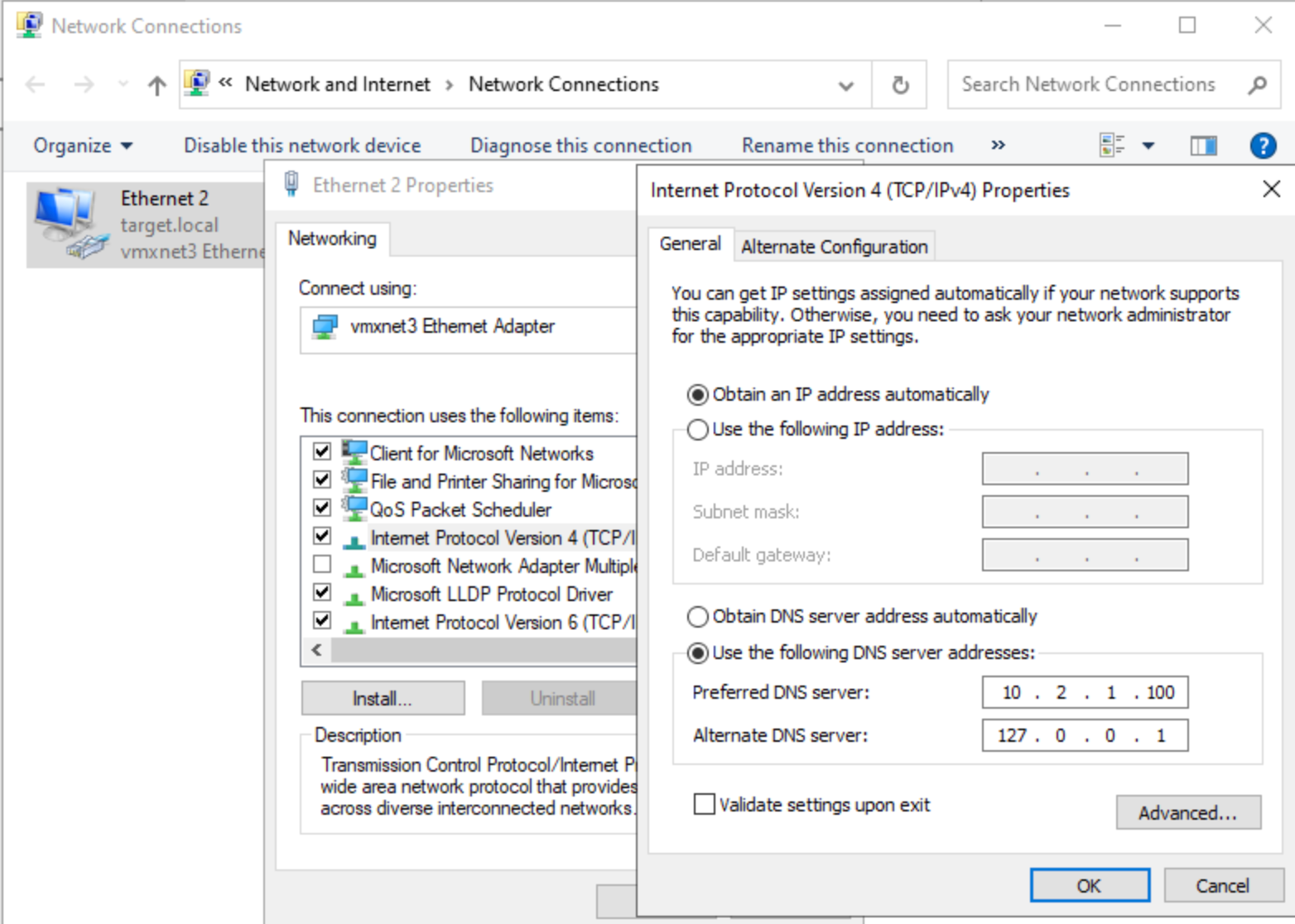 - Set the preferred DNS to the IP of the first Domain Controller: