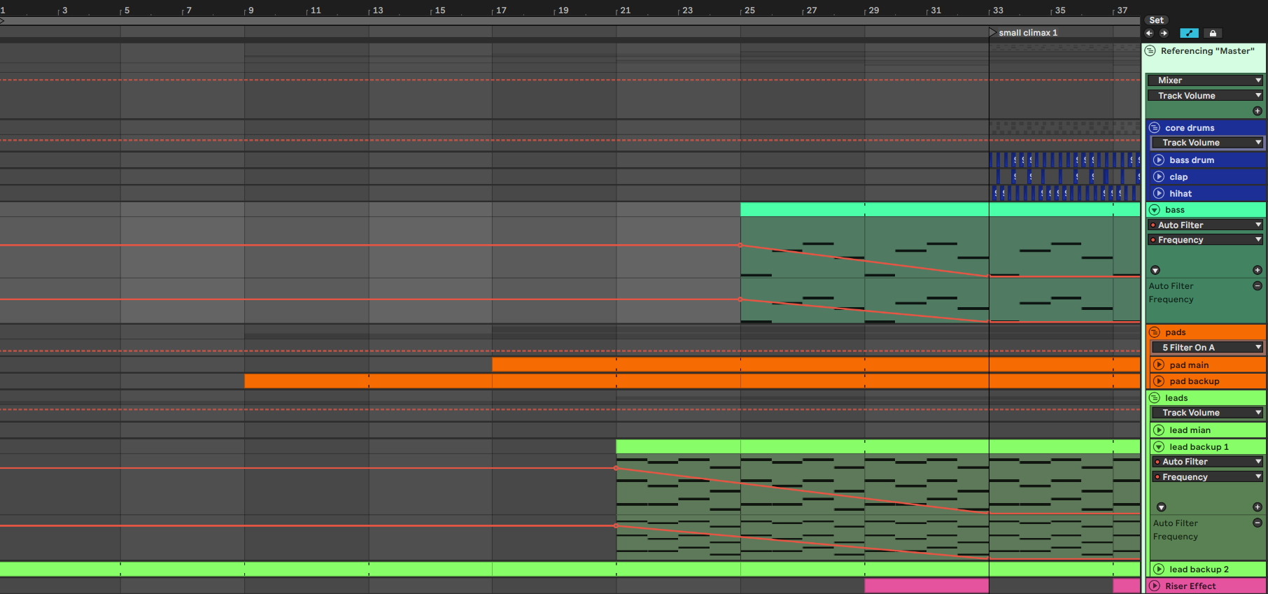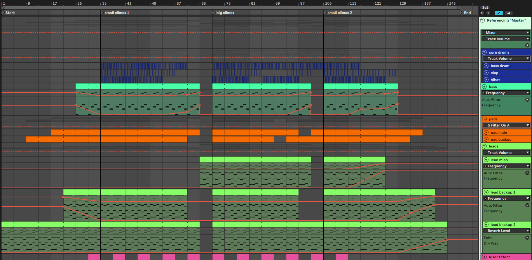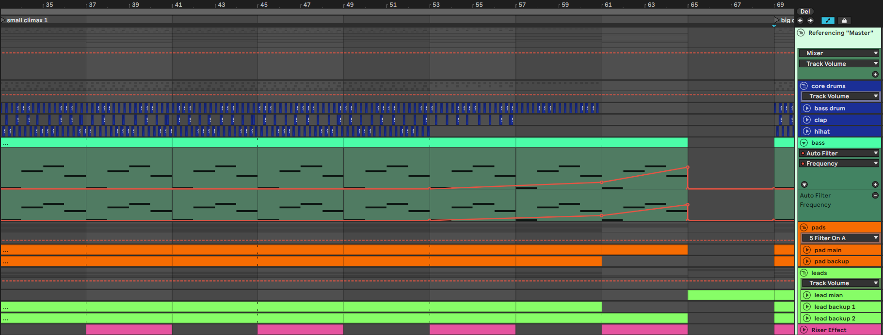 - Starting with only the backup leads, then introducing the pad sounds and finally the drums with the main lead