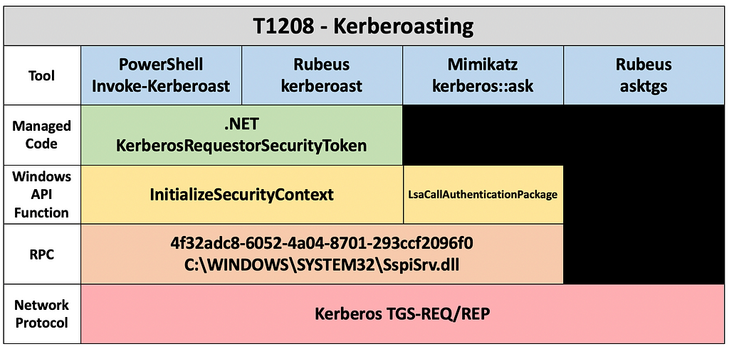 In the blog mentioned in the footnote below, they go about their process of peeling away the different abstraction layers of Kerberoasting, from tools all the way down to the network layer.