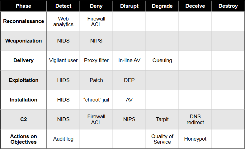 The intrusion kill chain becomes a model for actionable intelligence when defenders align enterprise defensive capabilities to the specific processes an adversary undertakes to target that enterprise. Defenders can measure the performance as well as the effectiveness of these actions, and plan investment roadmaps to rectify any capability gaps. Fundamentally, this approach is the essence of intelligence-driven CND: basing security decisions and measurements on a keen understanding of the adversary.
