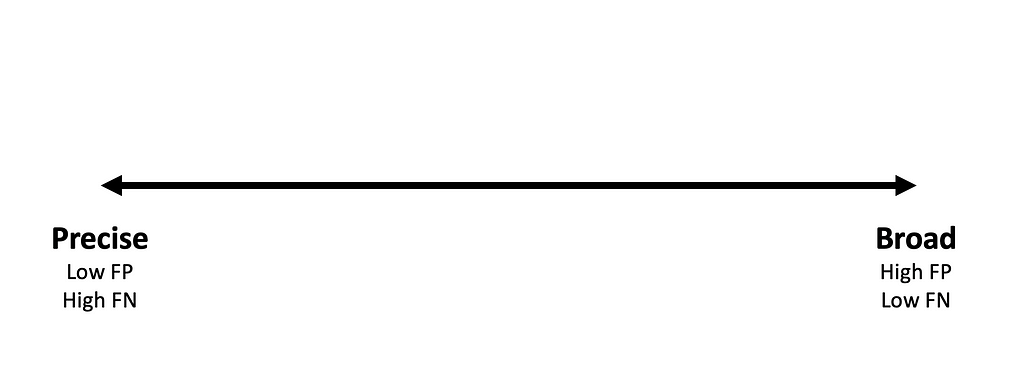 The precise end of the spectrum represents detection logic that values the reduction of potential false positives over the reduction of potential false negatives. E.g.: A detection looking for a malicious tool based on its hash. By definition, this approach is unlikely to produce false positives (a legitimate event that collides with the malicious binaries hash), but false negatives (a malicious event that does not share this hash value) are very likely.
