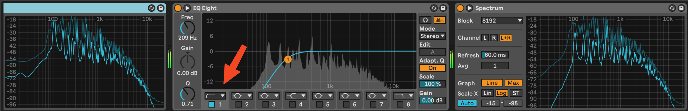 The sound is a bit too chaotic now, so we use the equalizer, Ableton Live’s EQ8, to cut unwanted low frequencies away and make it cleaner. This is basically a step of Mixing, but it’s not a bad idea to already do this now.