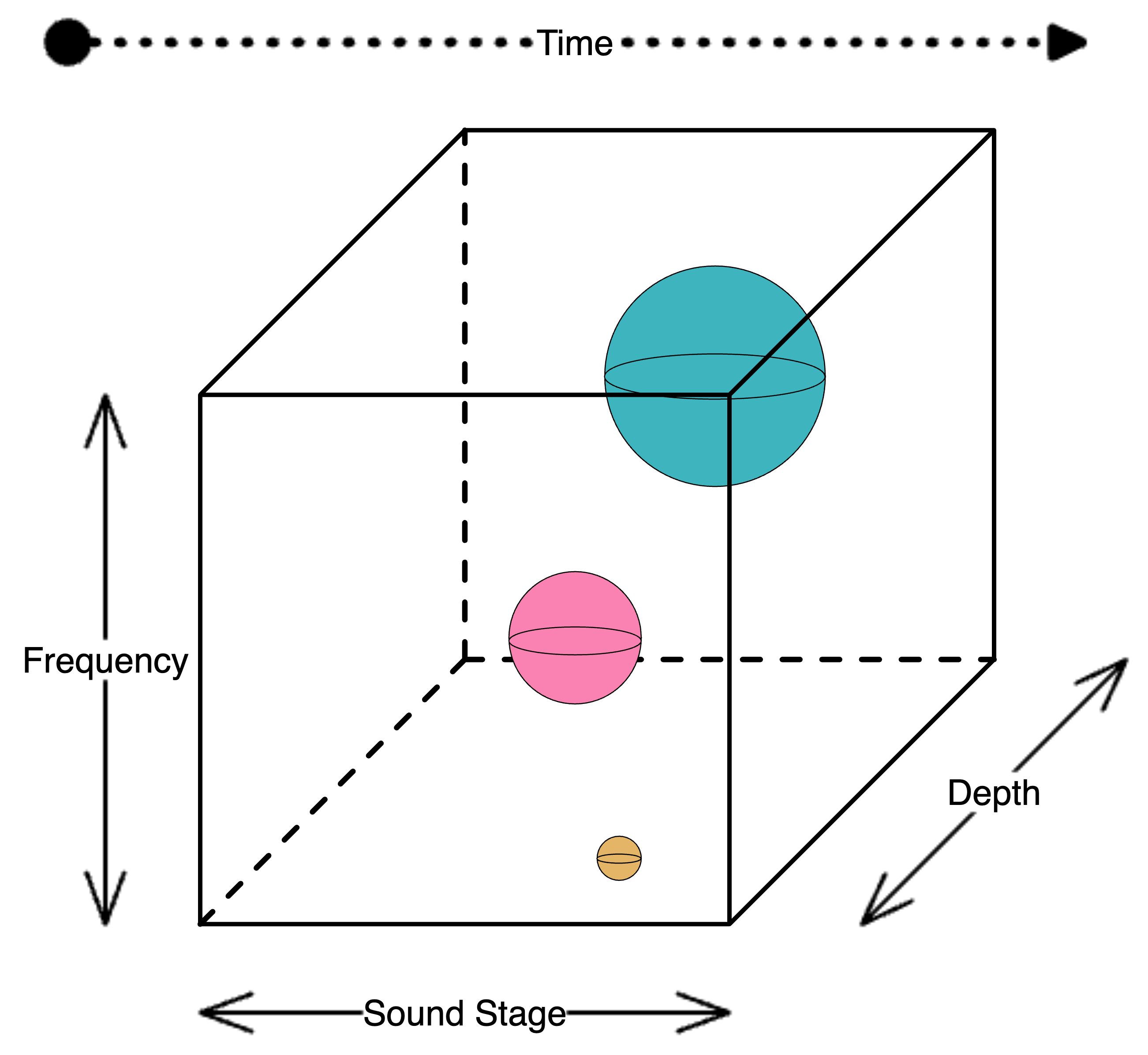 During mixing, we want to intentionally place our elements within this space, use the dimensions to give some elements a higher priority than others and create a hierarchy of focus of the elements in our song.