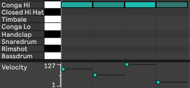 Defines how fast or slow you hit a sound. If you hit it fast it’s loud and bright, if you hit it soft it’s quiet and pale. In Ableton Live you can change it in the piano roll like this: