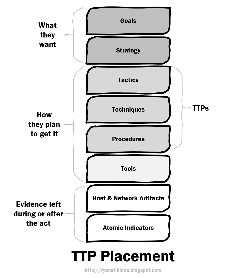 What’s left are the the Host & Network Artifacts and Atomic Indicators which constitute the evidence left during or after the act of attempting (successfully or not) to fulfill any part of their goals. The key distinguishing factor in these elements is that they are indicators that are left behind as a result of the higher level TTPs taking place. They’re the breadcrumbs on which most all detection technology is based, so it’s important to not underestimate the significant contribution of these next two levels. It’s through the data collected at these next two levels that the above levels can be observed. Unfortunately, too much focus gets placed on these levels and we hyper-focus on just Artifacts and IOCs. We often fail to retain necessary relationships and surrounding context that facilitates our understanding of the higher elements.