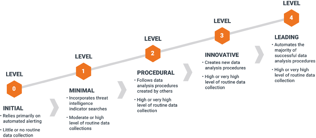 Of these factors, the analysts’ skills are probably the most important, since they are what allows them to turn data into detections. That’s why each level of the Hunting Maturity Model (HMM) starts with a statement of the level of analytic capability that is typically found at that level.