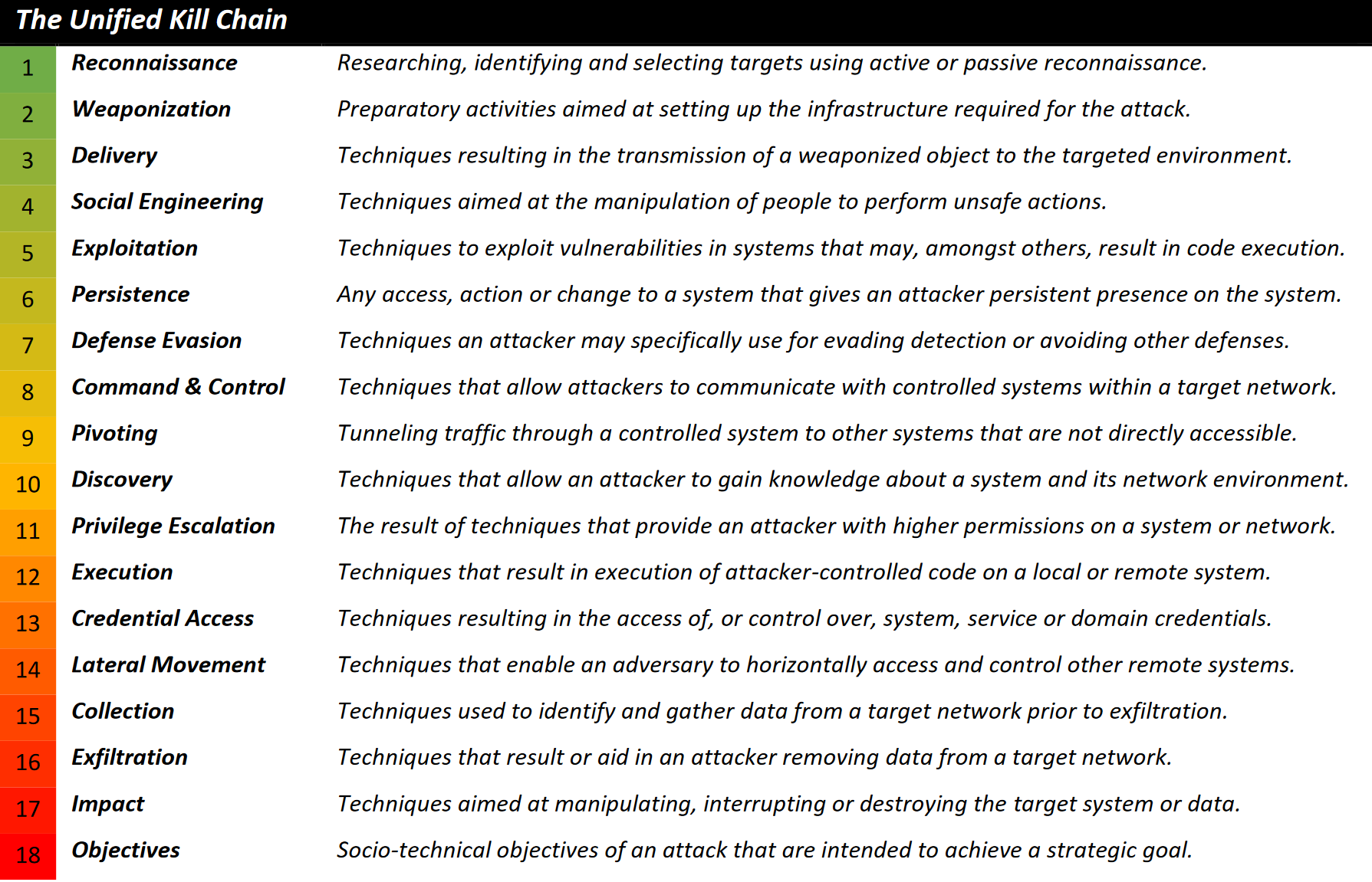 The Unified Kill Chain unites the Cyber Kill Chain with MITRE ATT&CK and extends on them by addressing their critiques: